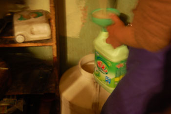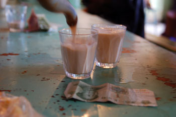 お金を机においておくと、空になったグラスにチャイを注いでくれる。お金は持って行かれるけど、一杯5角(7円?)